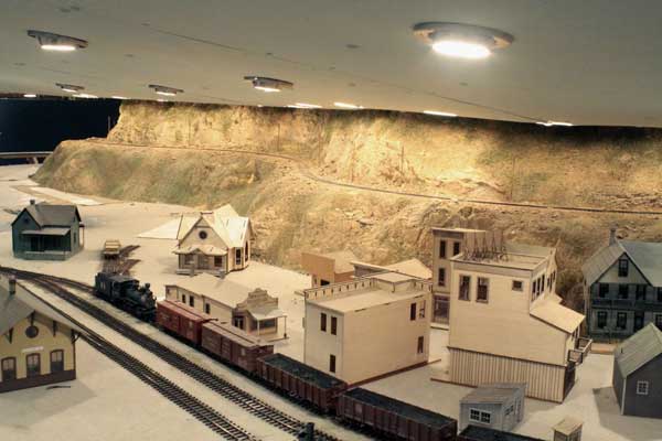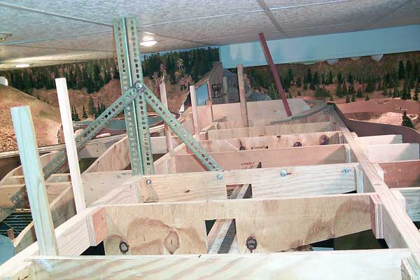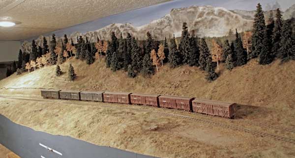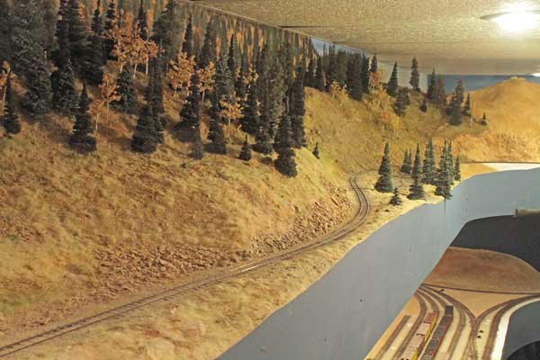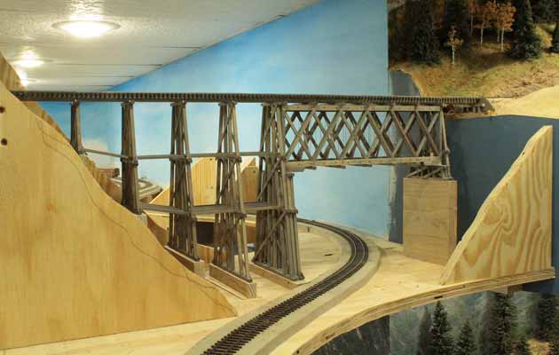 The track running beneath the trestle is the mainline heading up to Dallas Divide (located in the alcove beyond) from Ridgway. The plywood base is 58-inches above the floor. The trees you see in the lower right corner are those around the Maude Monroe mine outside of Ridgway.