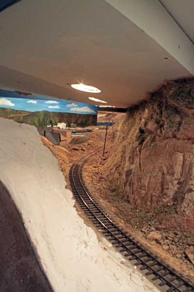 Just beyond Dallas Divide is where all the house's services (phone, electric, water) are located. For maintenance purposes, I decided to install a "liftout" in this area. It's the section of the railroad in the picture with the masonite fascia in place. The section is approximately 62-inches long and is made from two 1-inch layers of foam insulation board. It's held in place by four rare-earth magnets, an idea taken from one of Jim Vail's articles in the Gazette. It works quite well!