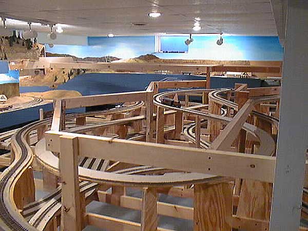 AT THIS POINT YOU CAN SEE THREE OF THE FIVE BRIDGES. BRIDGES 4 AND 5 ARE JUST BELOW THE LOWER LEFT CORNER. THE RIVER BOTTOM IS STILL JUST PLYWOOD, BUT SCENERY ISN'T FAR OFF.