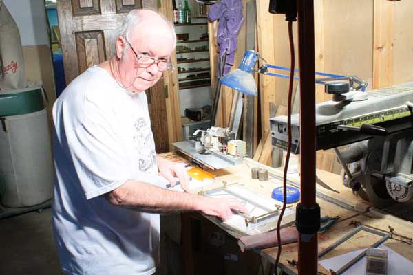 Bill did some great work while he was here building the trestle that carries the RGS over the last "duckunder". The track is running from Lizard Head, into and through the furnace closet, and eventually on to Rico. In the photo Bill is making one side of the bridge.